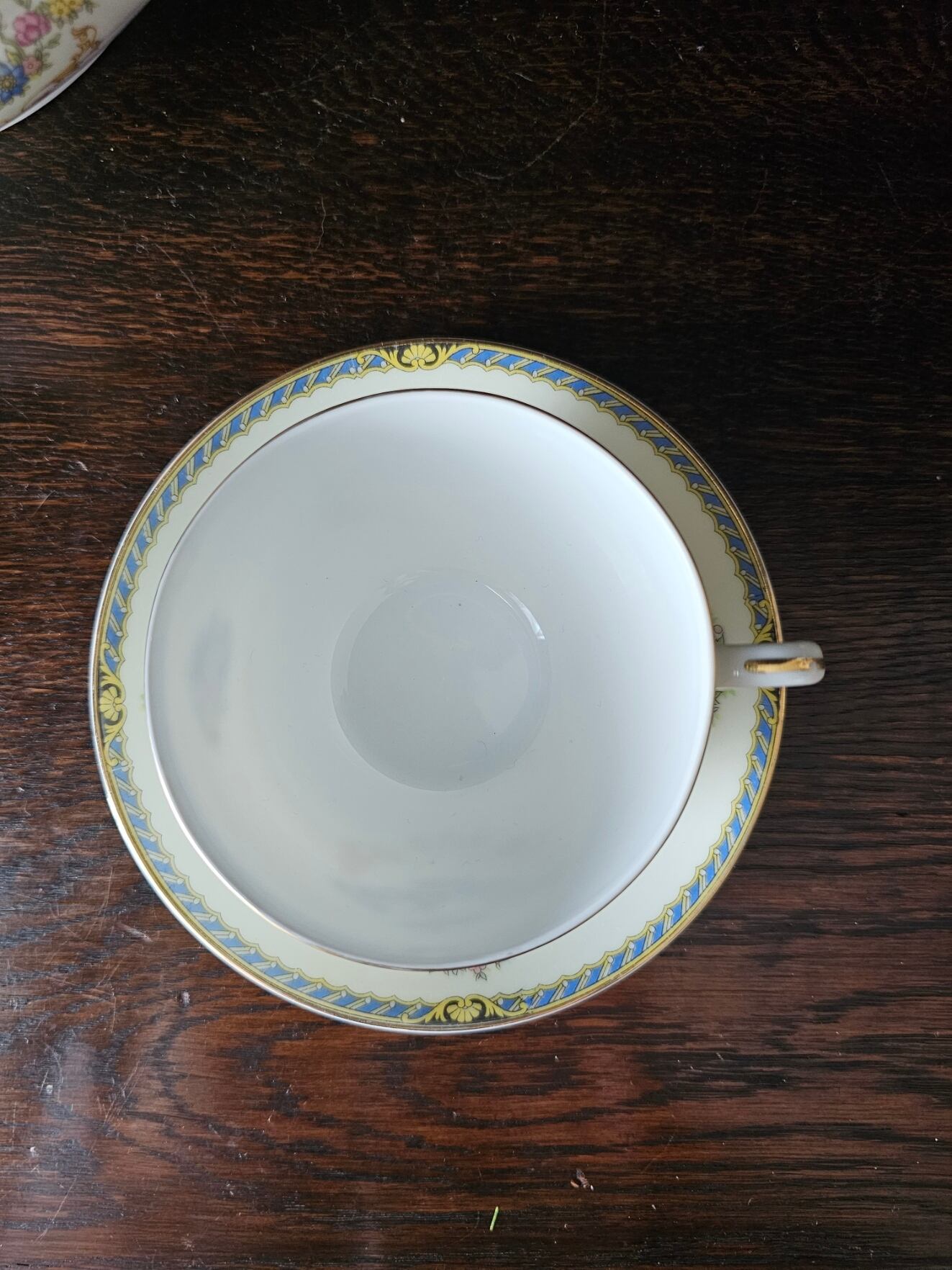 金縁持ち手部分一部剥げあり(写真ご参照ください)縁の部分はそれほどダメージはみられません。ヒビカケなし。